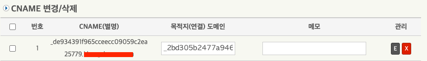 윗 사진이랑 값 비교해보세요. 좌측이 왼쪽 CNAME 값, 우측이 목적지 도메인 입니다.(마지막에 . 은 지우세요)