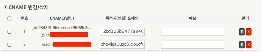 본인의 subdomain 주소와 Cloudfront.net 주소를 마찬가지로 DNSzi 에 추가해 줍니다. 아래 2번 항목처럼요.